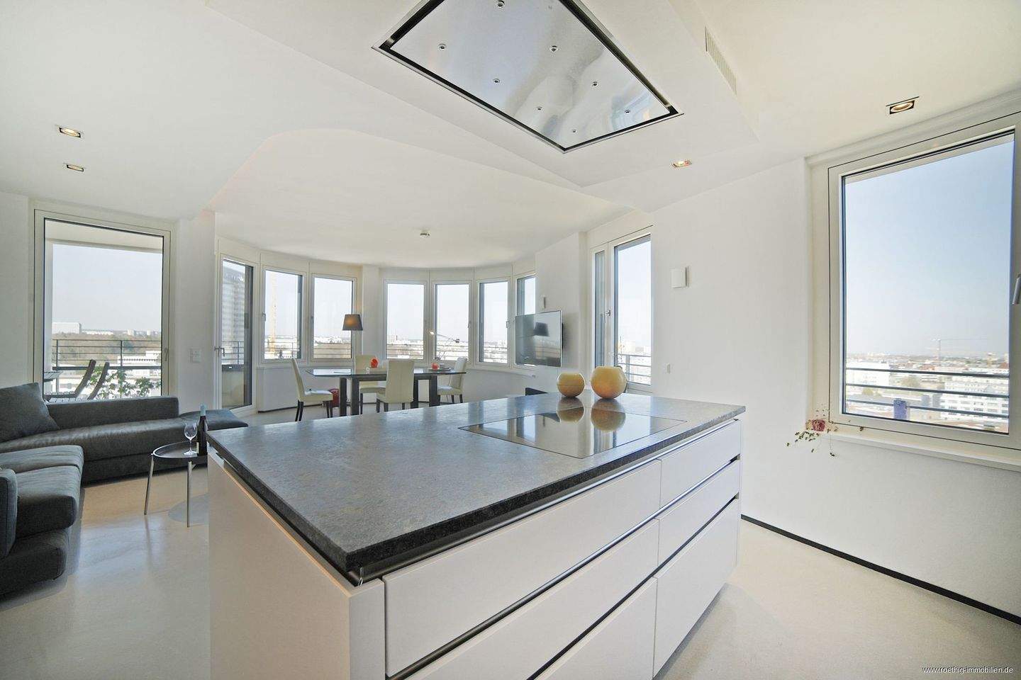 • Küche / Wohnzimmer - Alpenblick garantiert! Thalkirchen, helle, luxuriöse 2-Zimmer Wohnung im 12 OG mit TG-Einzelstellplatz!