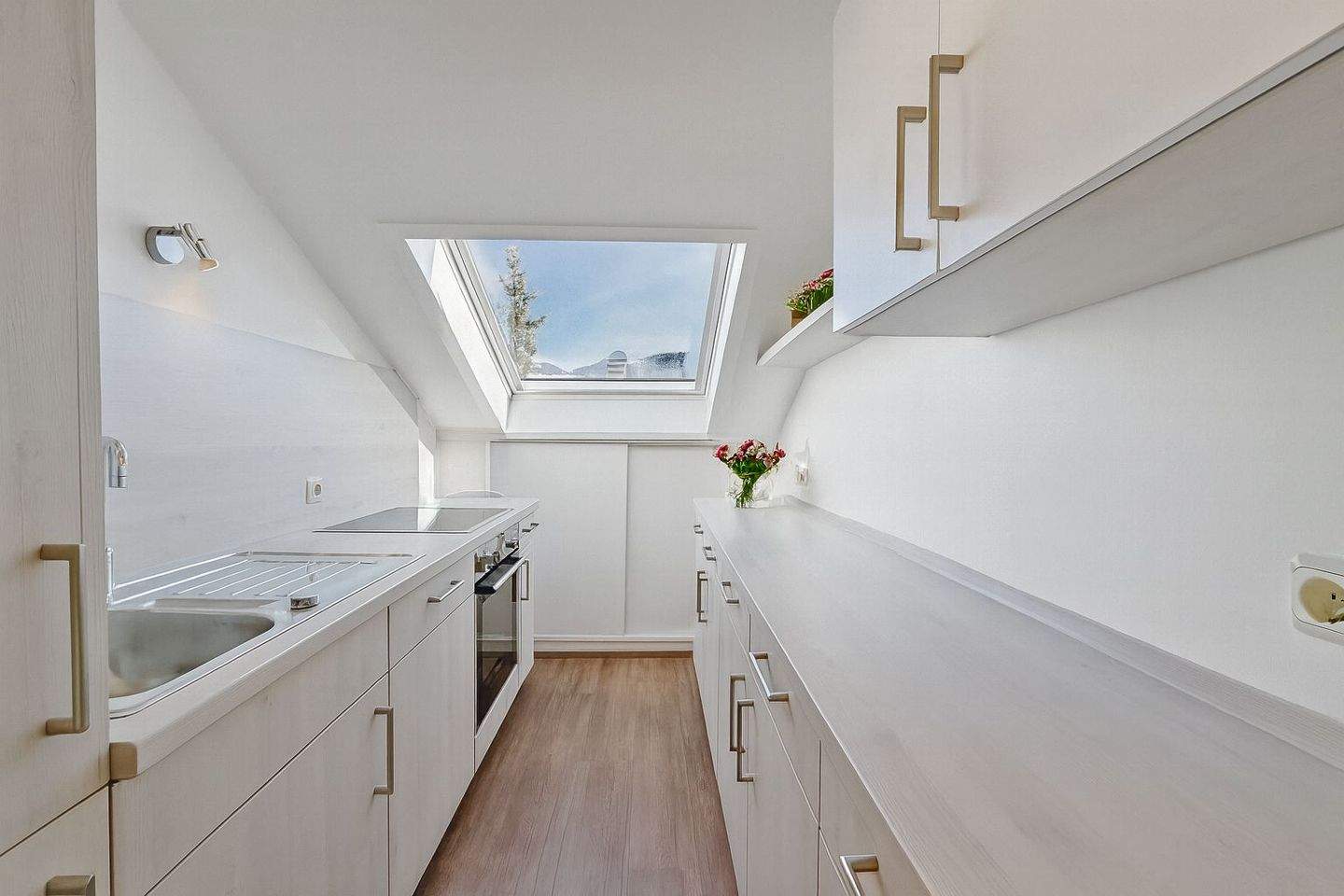 • Moderne zweizeilige Einbauküche (Foto mit KI bearbeitet) -