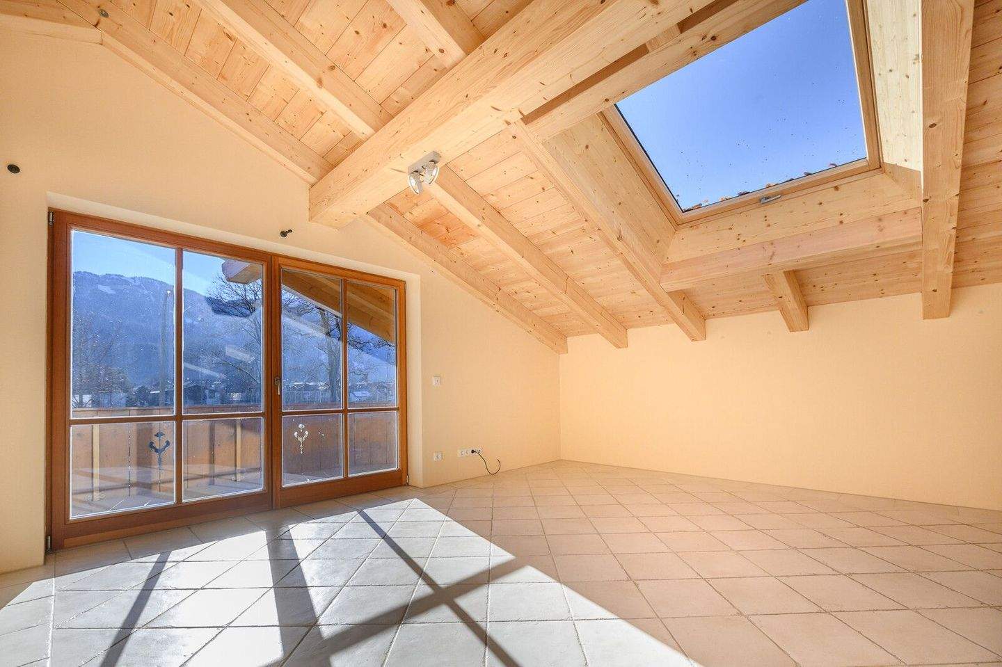 • Schlafzimmer mit Sichtdachstuhl und Balkonzugang -