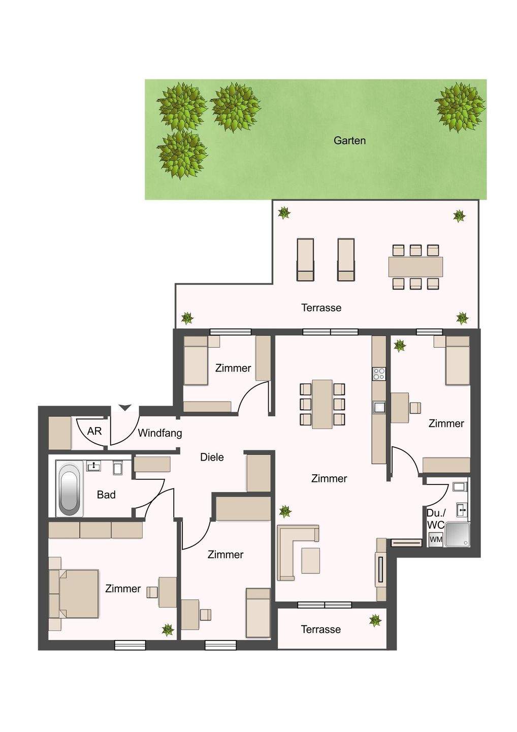 • Große Terrasse mit Gartenzugang -