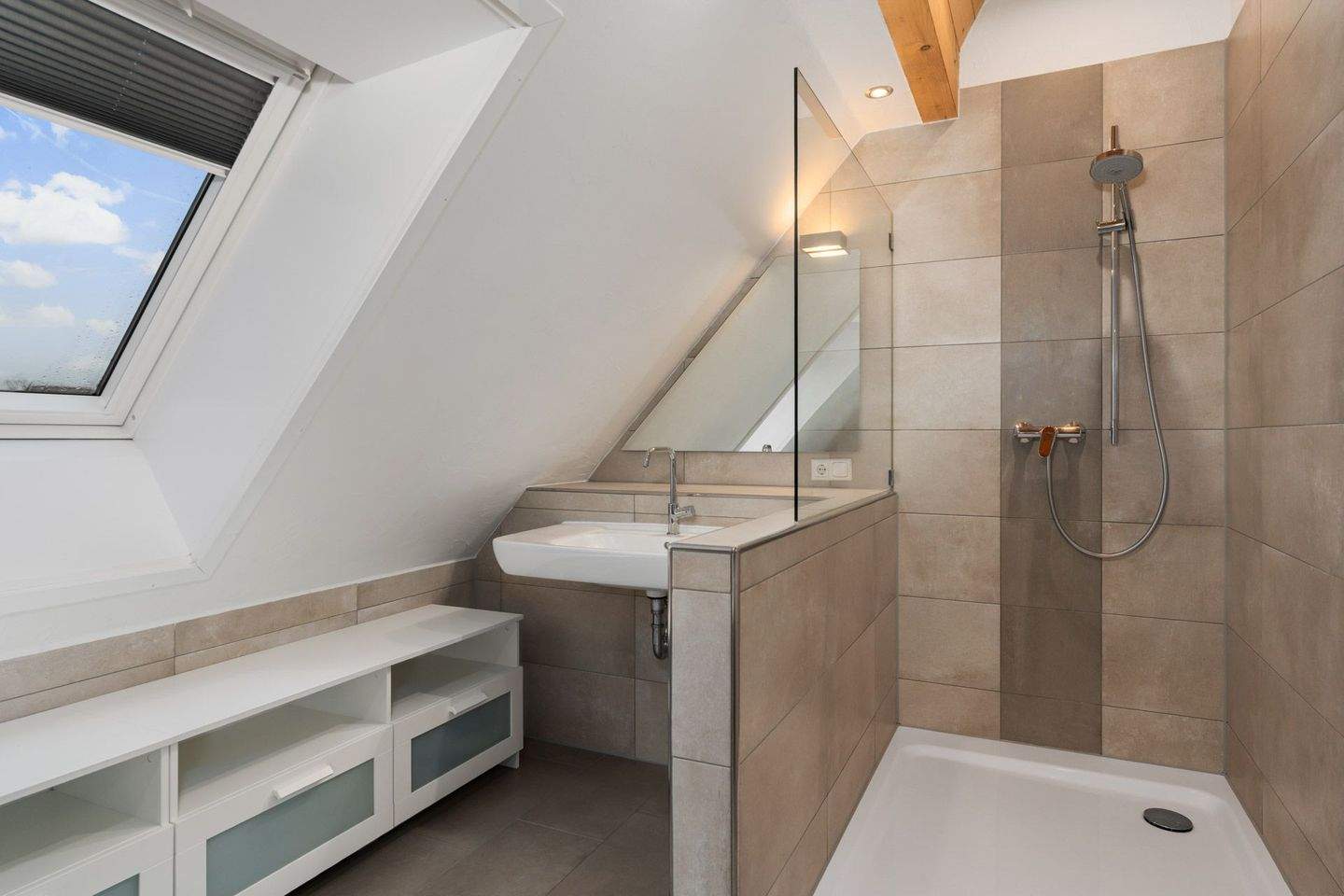 • Tageslichtbad (5,87m²) mit verglaster Eckdusche und Handtuchheizung. -