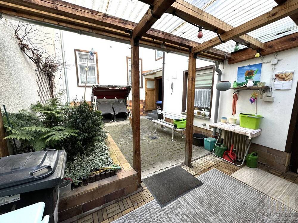 • Innenhof mit Terrasse, Hochbeet und rankendem Wein -