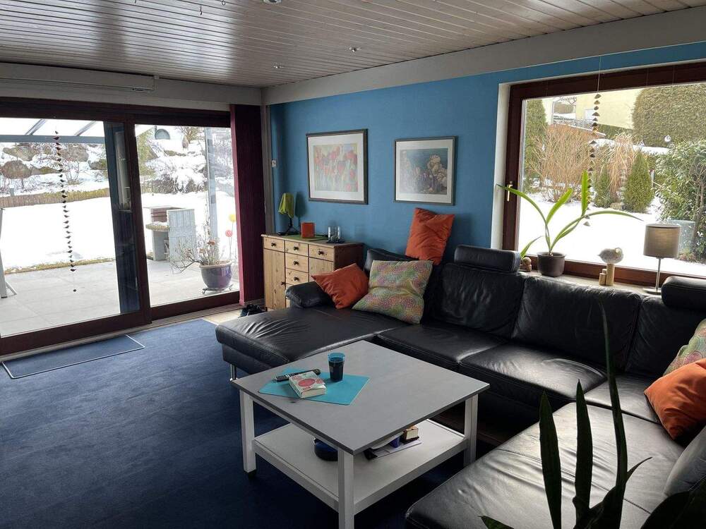 • Wohnzimmer mit Kaminofen und Ausgang zur Terrasse -