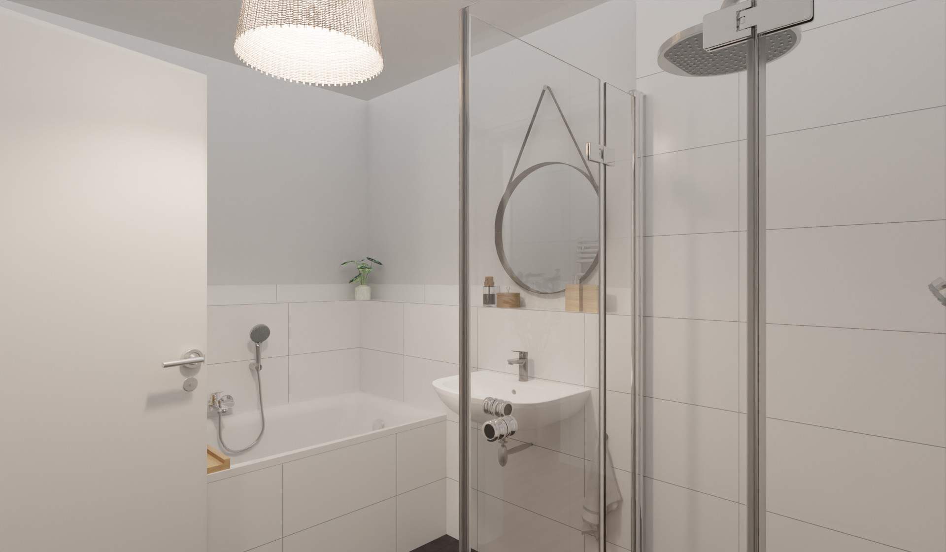 Modern gefliestes Badezimmer mit bodengleicher Dusche und Badewanne -
