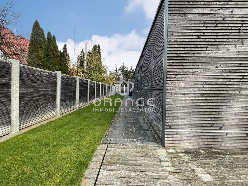 • Blick von der Westterrasse Richtung Osten zu den Hauszugängen -