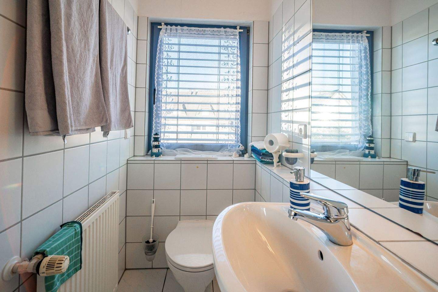 • Der Raum ist klassisch weiß gefliest und mit zwei Waschbecken ausgestattet. -