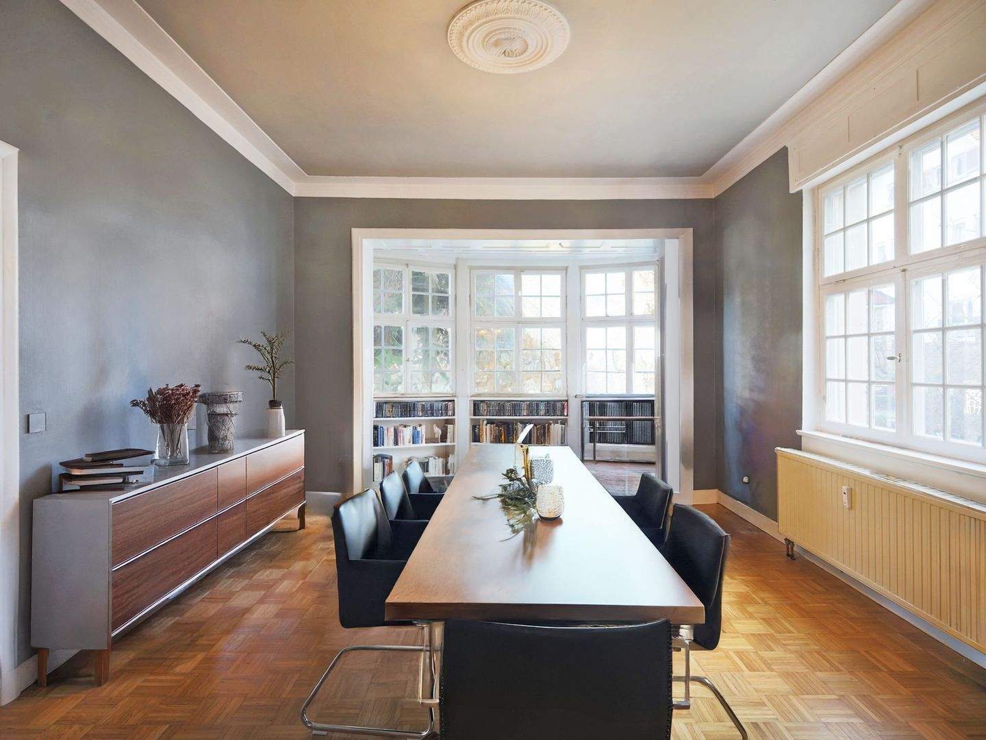 Helles, repräsentatives Esszimmer mit großem Erker und Parkettboden (Möblierung KI-generiert) - 9 Zimmer Mehrfamilienhaus, Wohnhaus zum Kaufen in Ludwigsburg