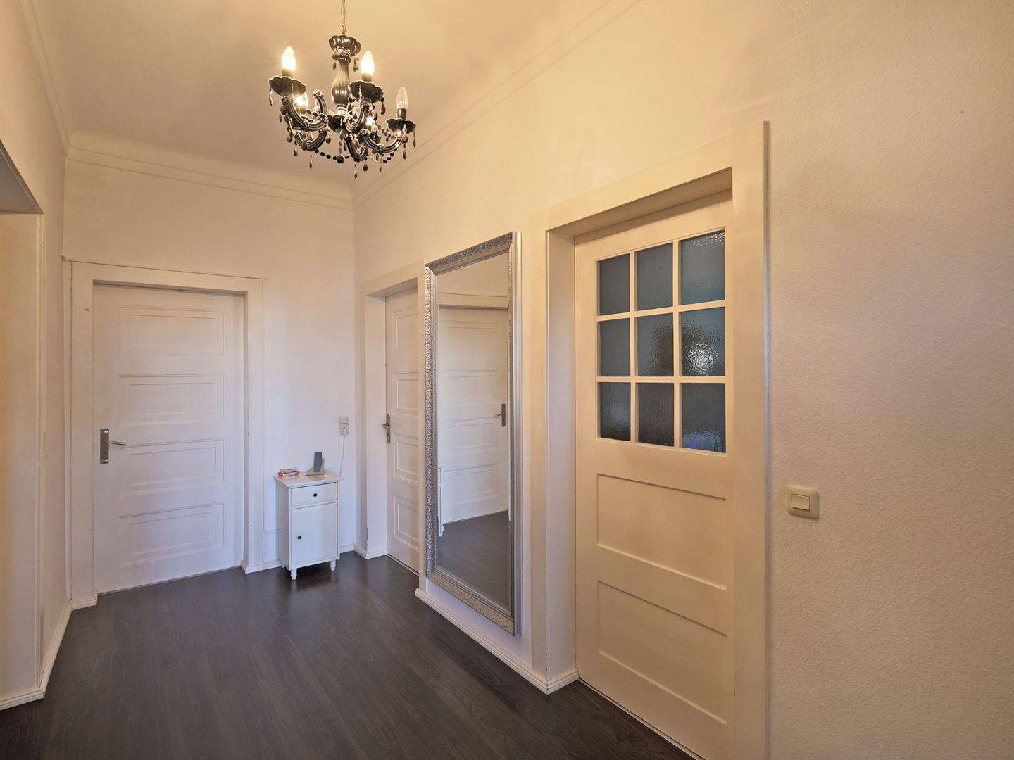 Zentraler Flurbereich im Obergeschoss mit dunklem Bodenbelag und weißen Stiltüren - Mehrfamilienhaus, Wohnhaus mit 283,00 m² in Ludwigsburg zum Kaufen