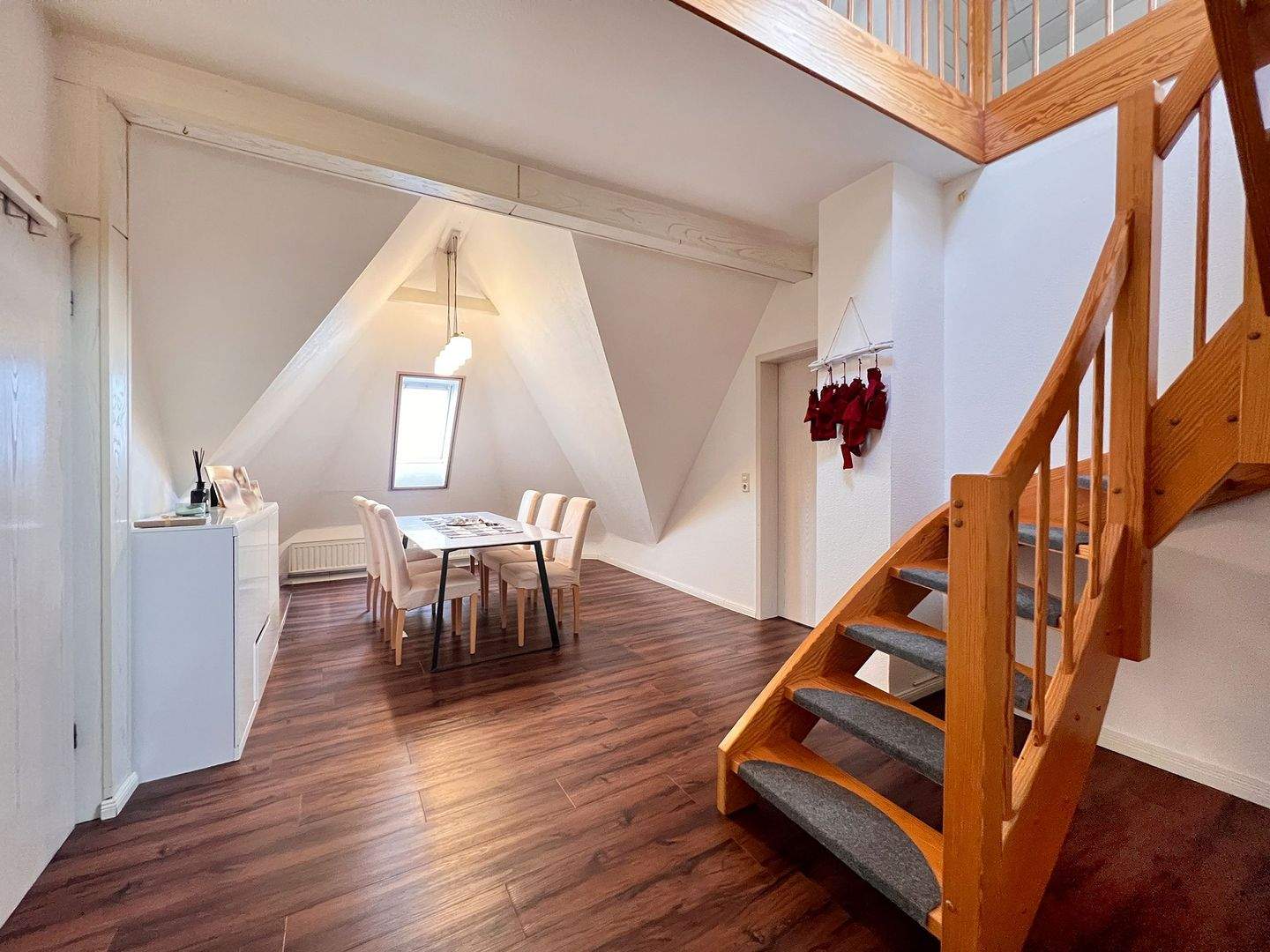 Repräsentativer Essplatz mit angrenzendem Treppenaufgang in die Galerie-Ebene -