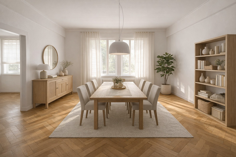 • Wohn- und Essbereich (virtuell möbliert) - 3 Zimmer Etagenwohnung in Düsseldorf
