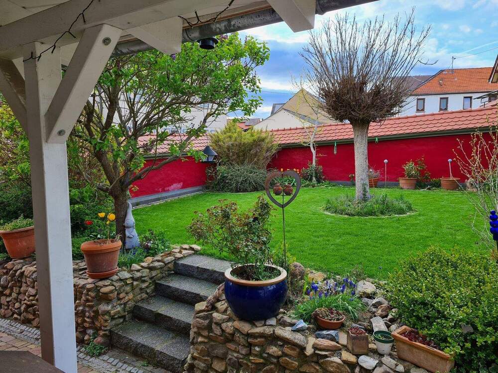 • Blick Grünfläche Freisitz und überdachte Terrasse -