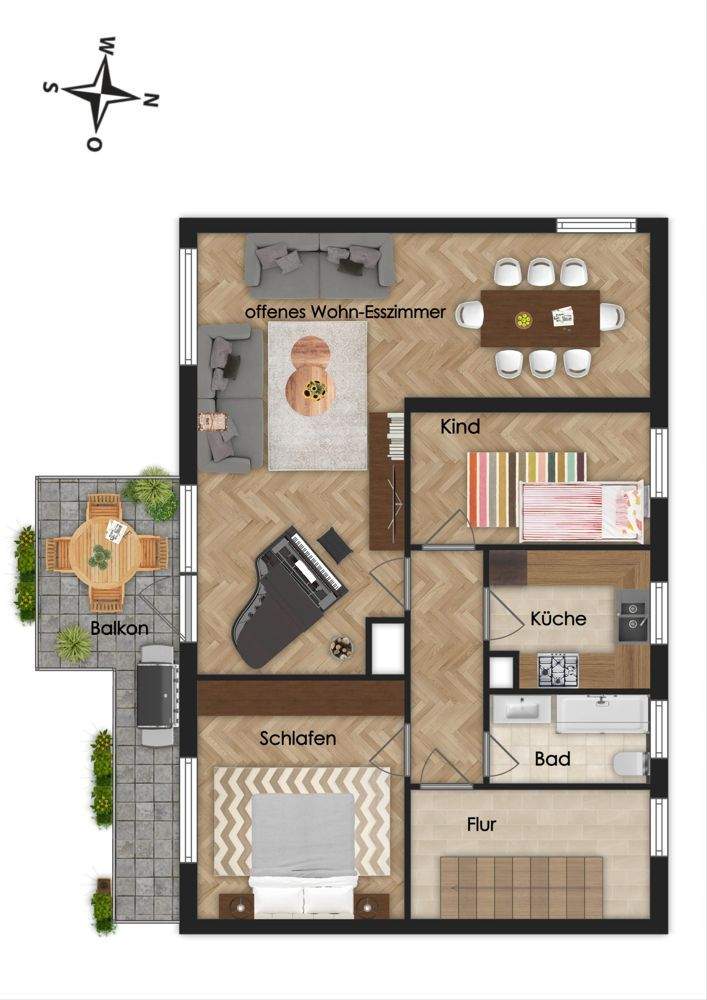 • Offenes Wohnzimmer mit Zugang auf den Balkon -