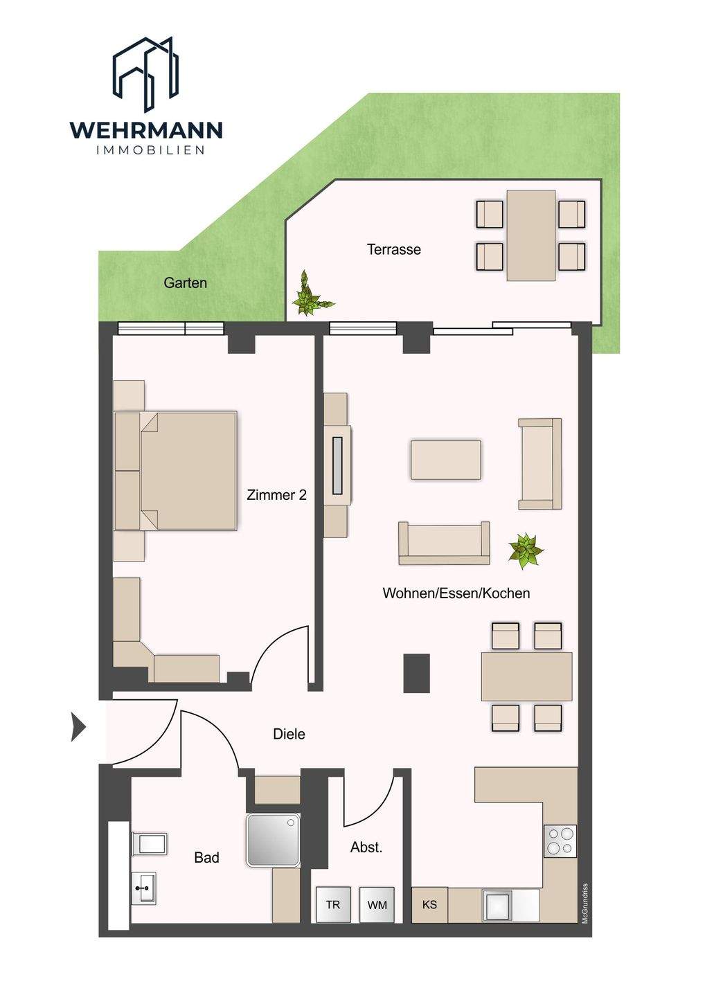 • Visualisierung Wohnzimmer - Stilvolle 2-Zimmer-Erdgeschosswohnung mit exklusiver Ausstattung, Terrasse & barrierefreiem Komfort
