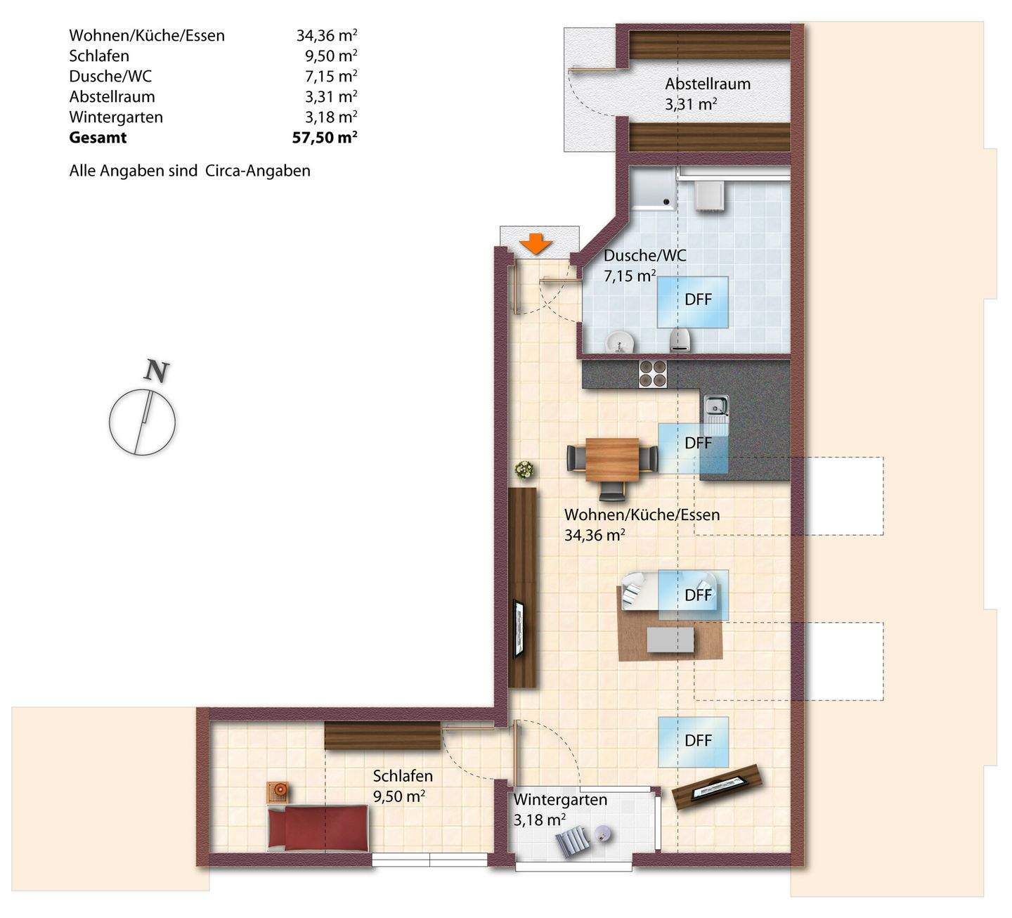 Gesamtgröße:ca. 57,00 m²