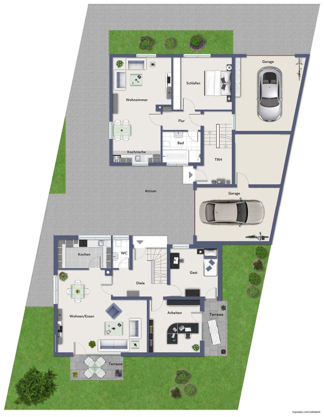 Hausansicht Vogelperspektive Straßenseite - 2 Einfamilienhäuser auf einem großen Grundstück mit Garagen und Garten!