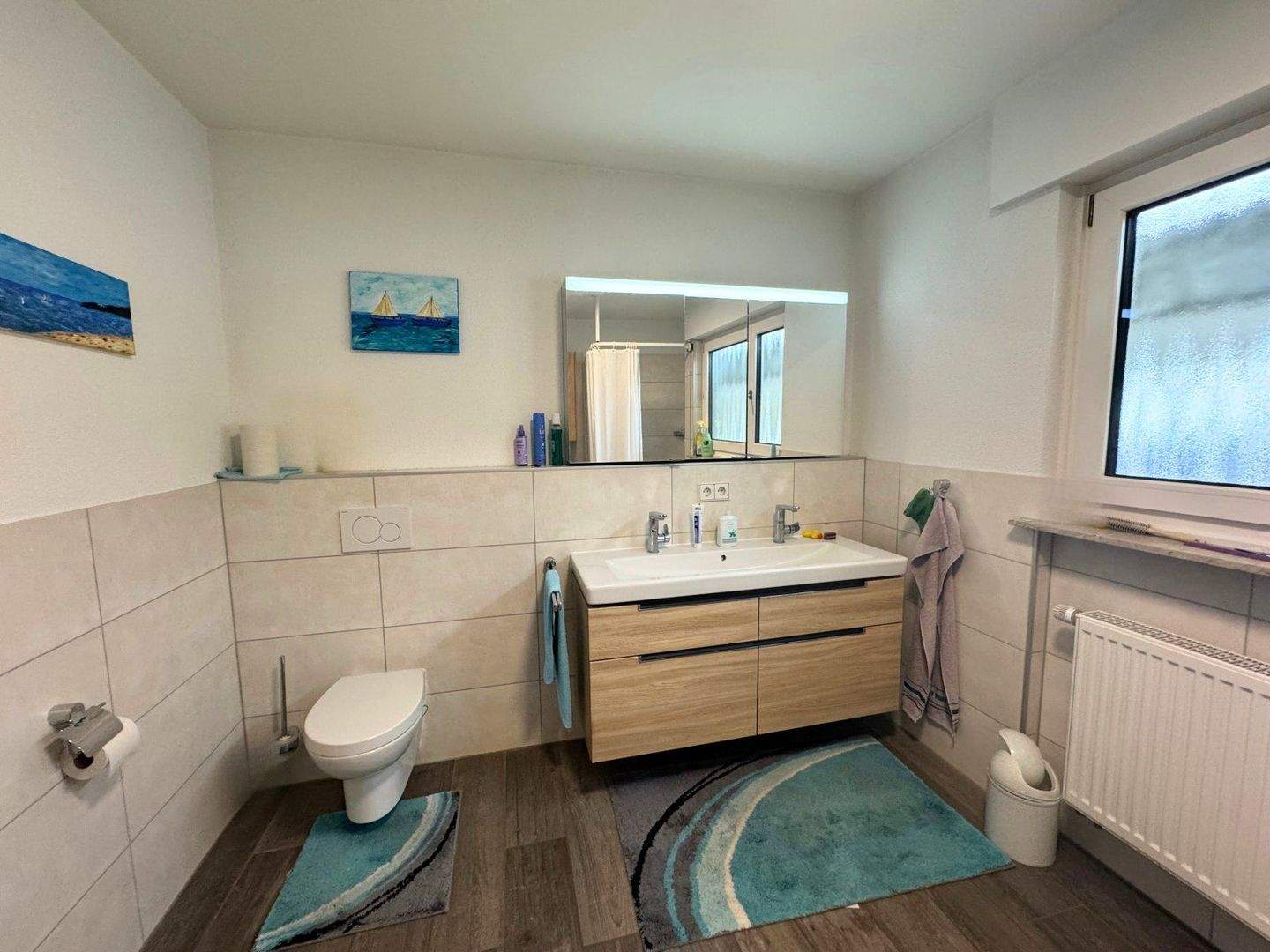 • EG Hauptbad mit Waschtisch, Spiegelschrank und WC -