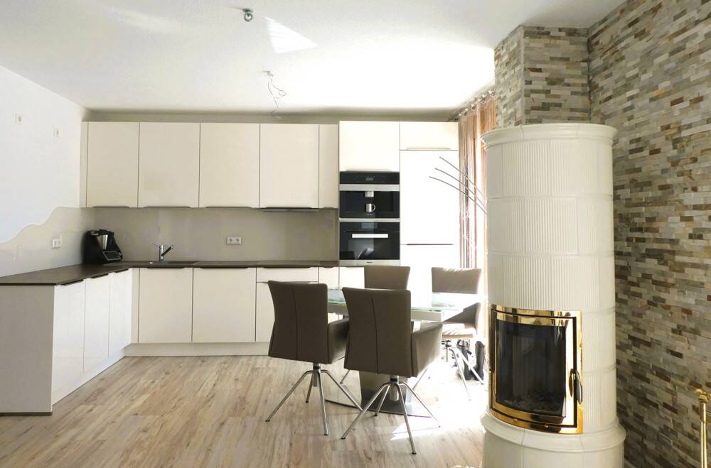 • Blick zum Küchenbereich mit Kachelofen -