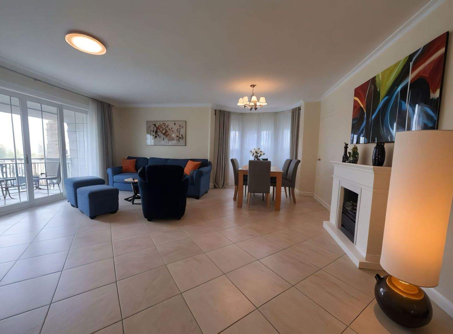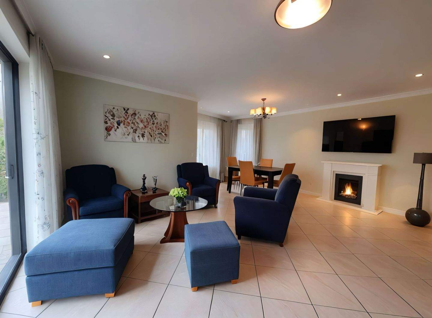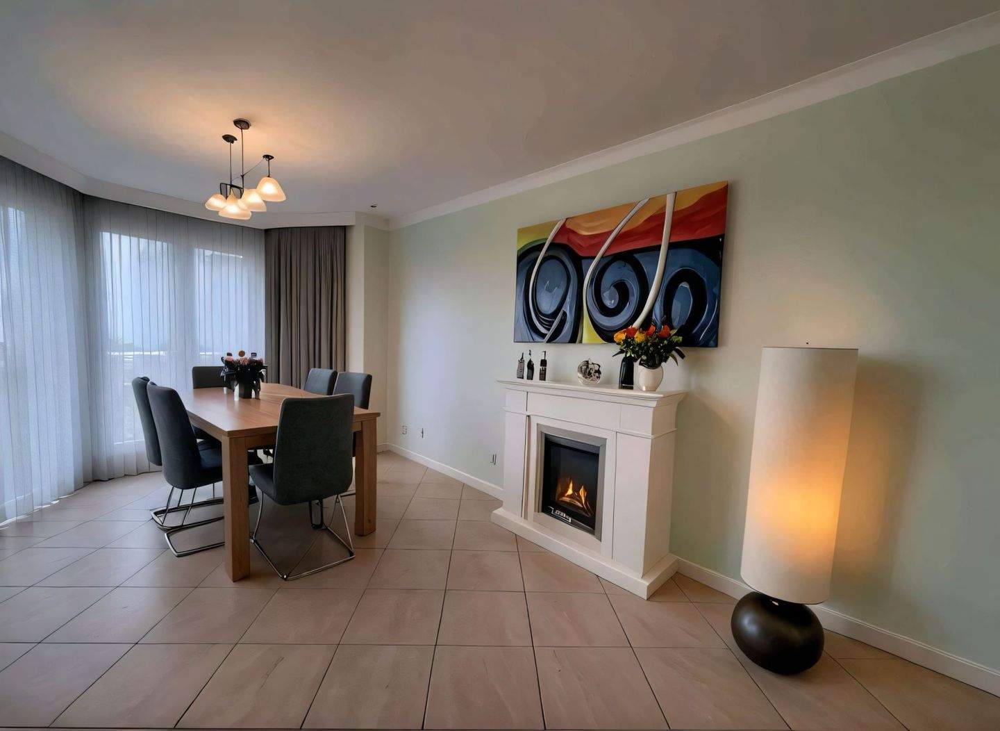 • Gemütlicher Wohn-Essbereich mit elegantem Kamin und lichtdurchfluteter Atmosphäre -
