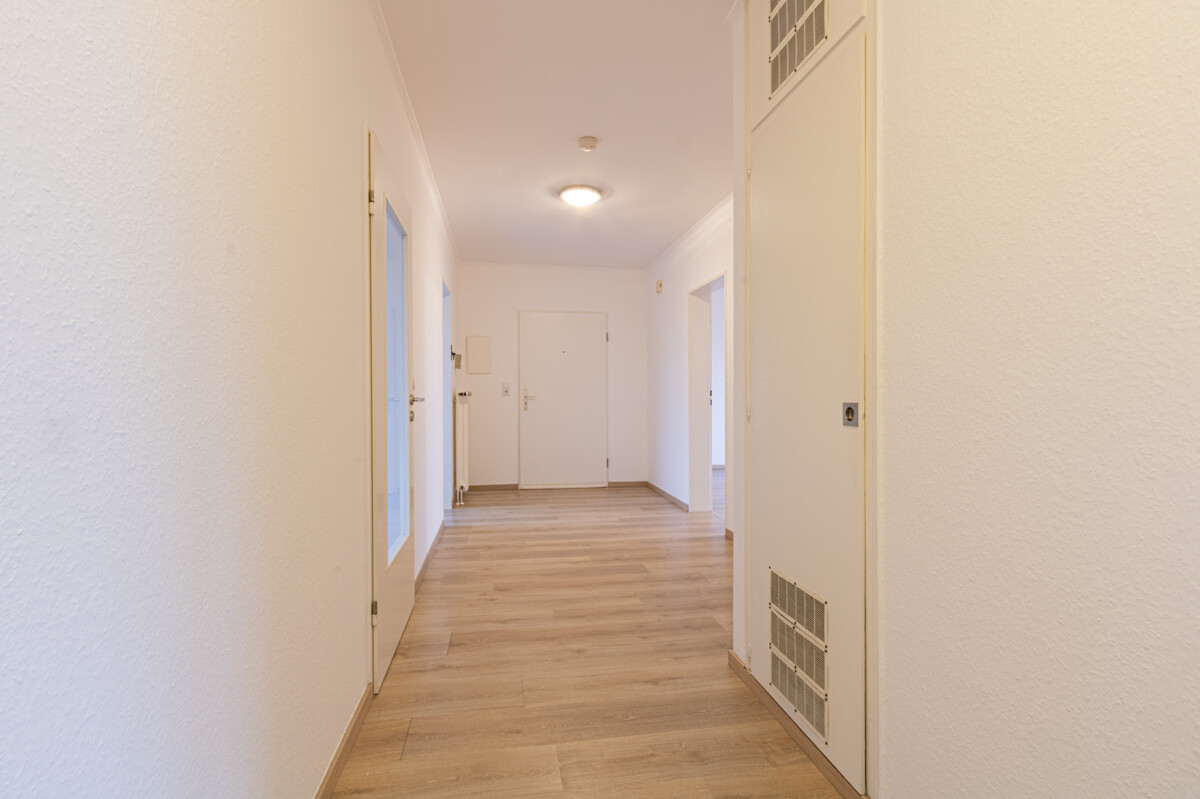 Die Küche, ausgestattet mit einer modernen Einbauküche, befindet sich auf der rechten Seite des Flures, vom Eingangsbereich aus betrachtet.