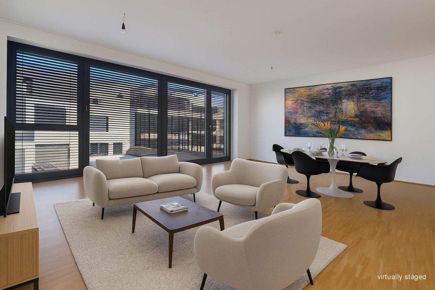 • Wohnzimmer virtually staged - Lichtdurchflutete, komfortable 3 Zimmer Wohnung in bester Mitte Lage