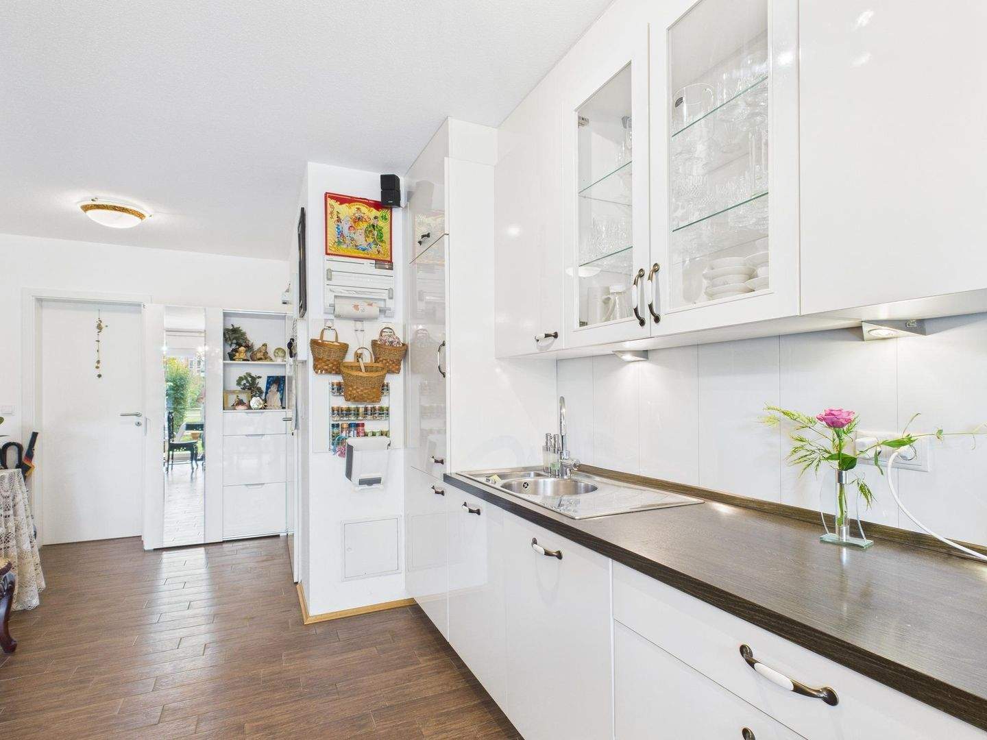 • Offener Küchen/Wohn/Essbereich mit Blick in den Garten - Charmante Erbpacht-Terrassenwohnung in beliebter Wohngegend