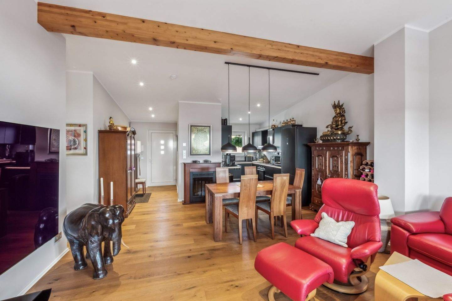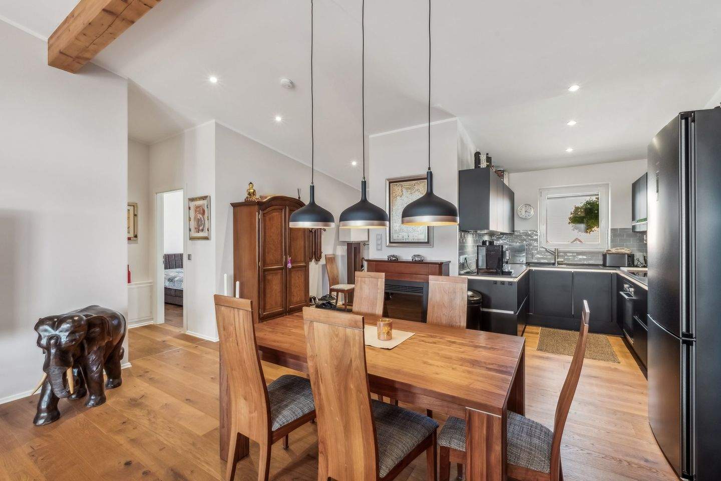 • Essbereich mit Blick in die offene Einbauküche -