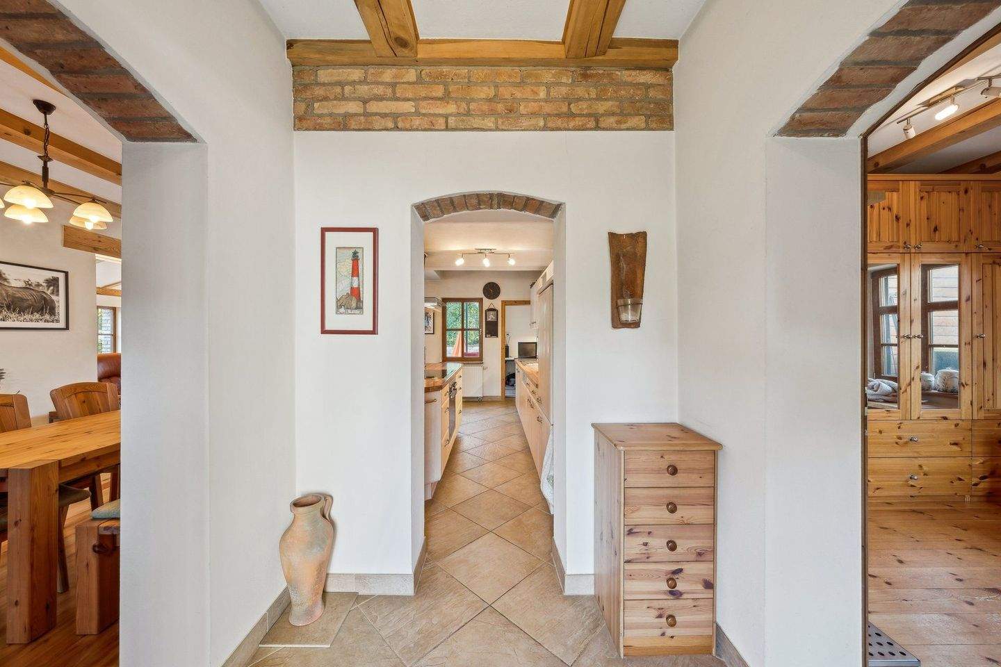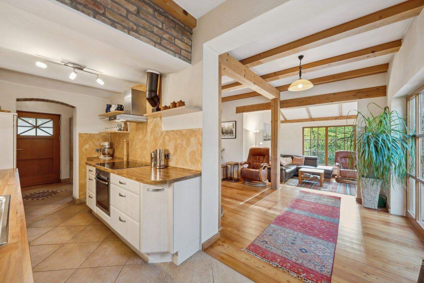 • Küche mit Glindower Ziegel - Blick in den Wohnbereich -
