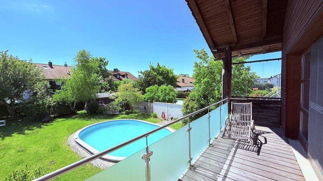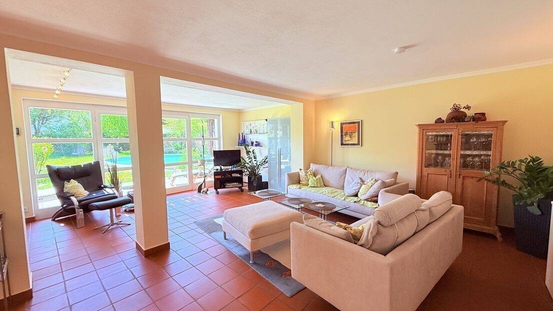 • Blick zum Pool und Garten - … AIGNER - elegantes Domizil in niveauvoller Umgebung mit großem Salzwasserpool + Baugrundstück ...