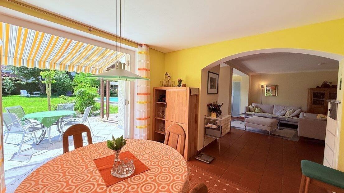 Blick zum Pool und Garten - … AIGNER - elegantes Domizil in niveauvoller Umgebung mit großem Salzwasserpool + Baugrundstück ...