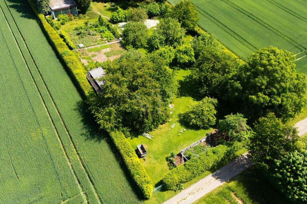 • Luftansicht Grundstück mit Nutzgarten, Obstwiese und Gartenhäuschen -