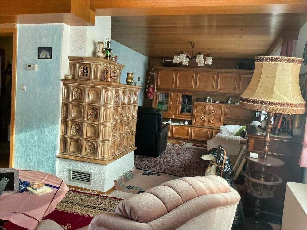 • Wohnbereich mit Kachelofen - digitales Homestaging - Möblierung dient der Illustration - Großzügige 2-Zimmer-ETW (Umgestaltung zu 3-Zimmer-ETW möglich) inkl. Balkon und großem Grundstück