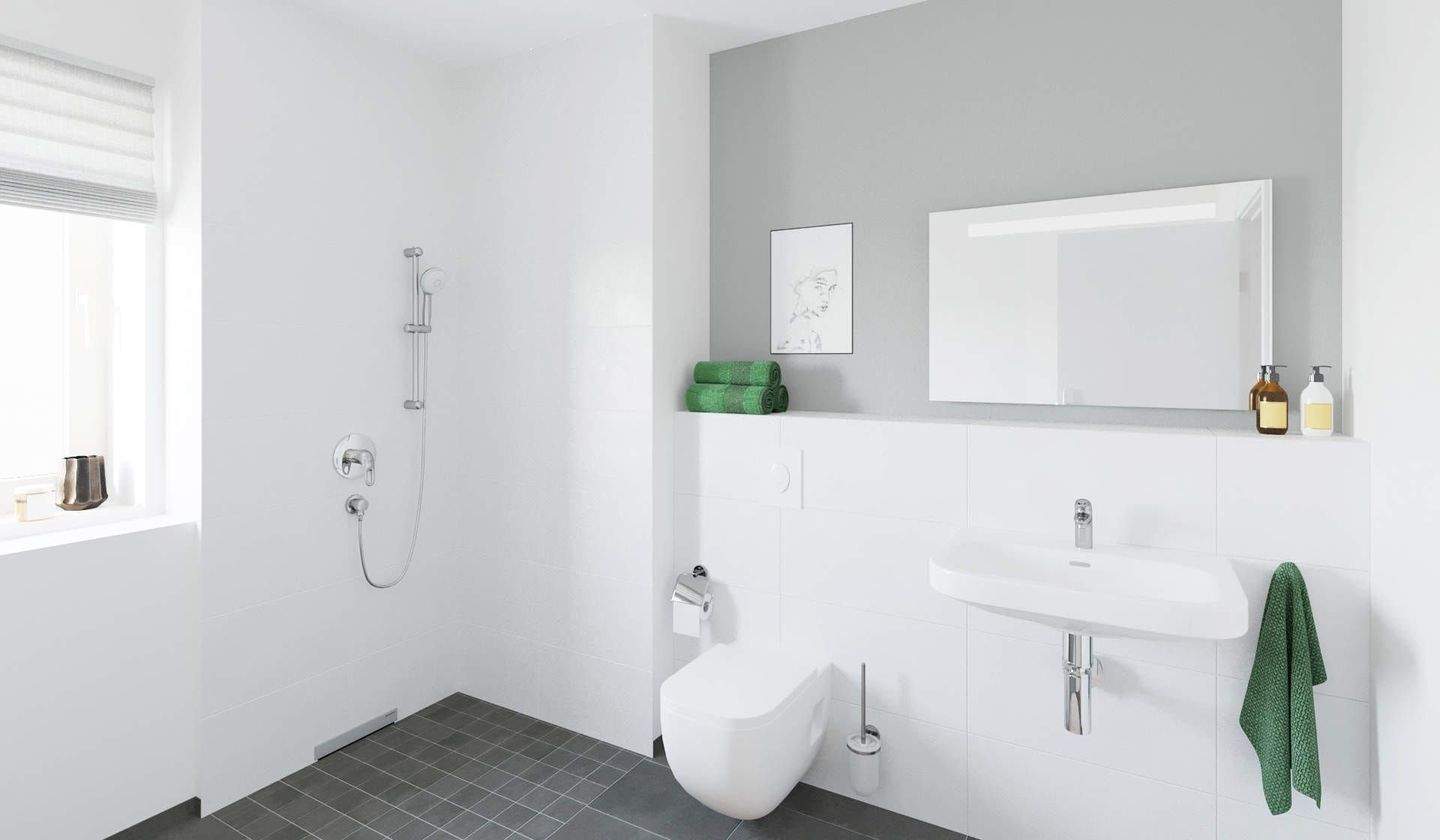 • Modernes Tageslichtbad mit bodengleicher Dusche un -