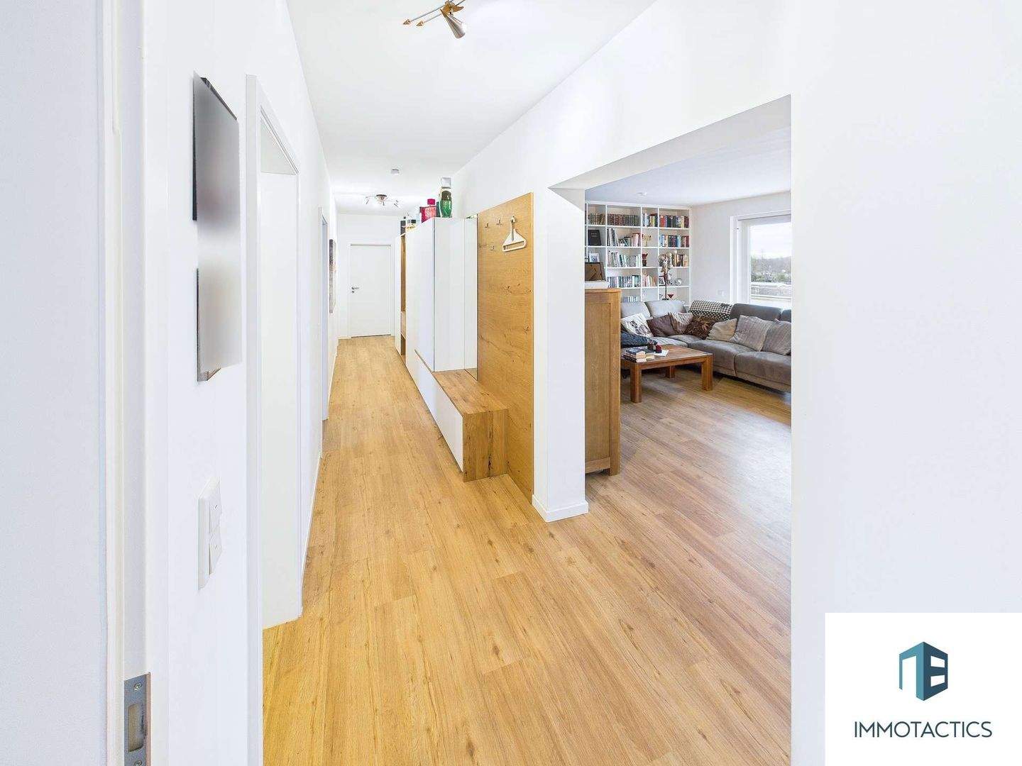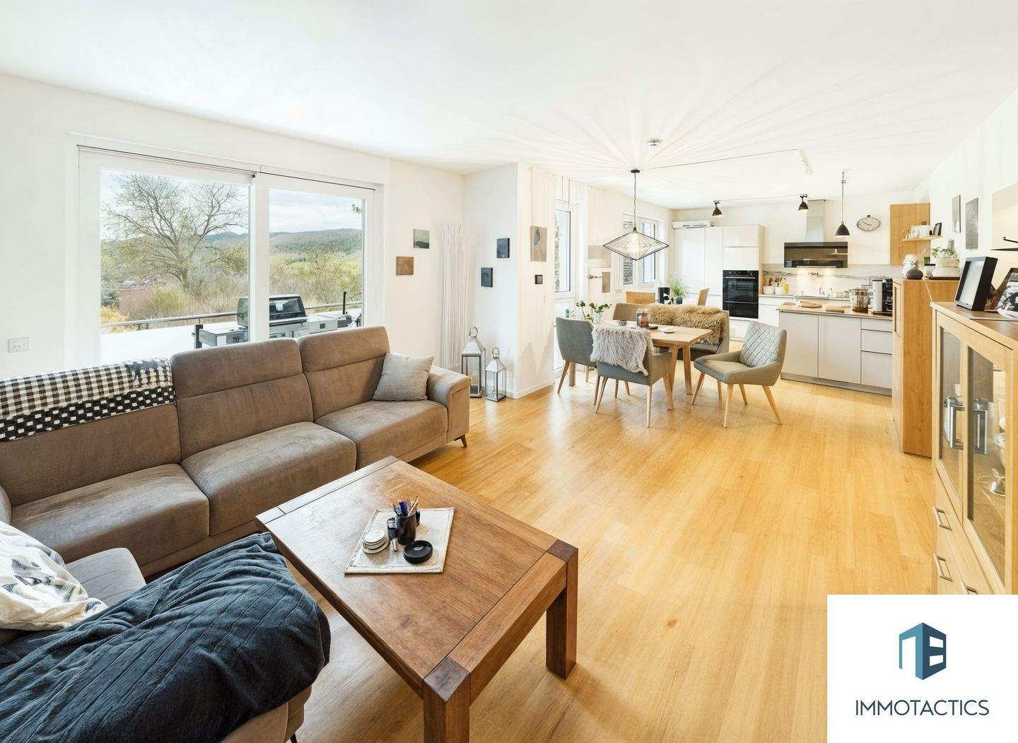 • Wohnzimmer - Blick zur Küche - Moderne 4-Zimmer-Wohnung mit Balkon und Blick ins Grüne, Wärmepumpe und hochwertiger Ausstattung