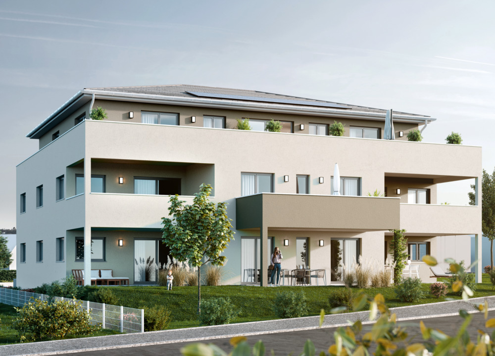 Mehrfamilienhaus außen - Gehobene Neubauwohnung mit überdachtem Balkon