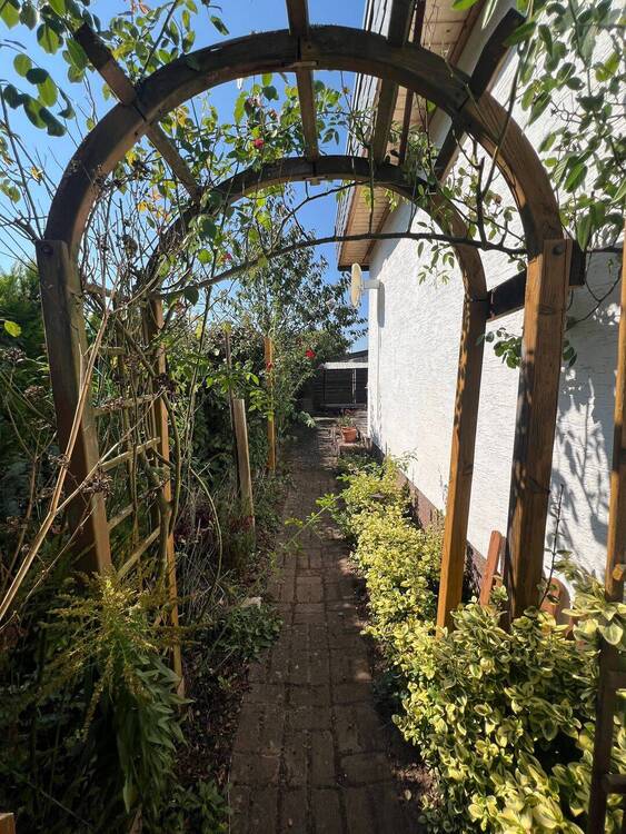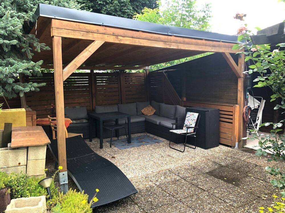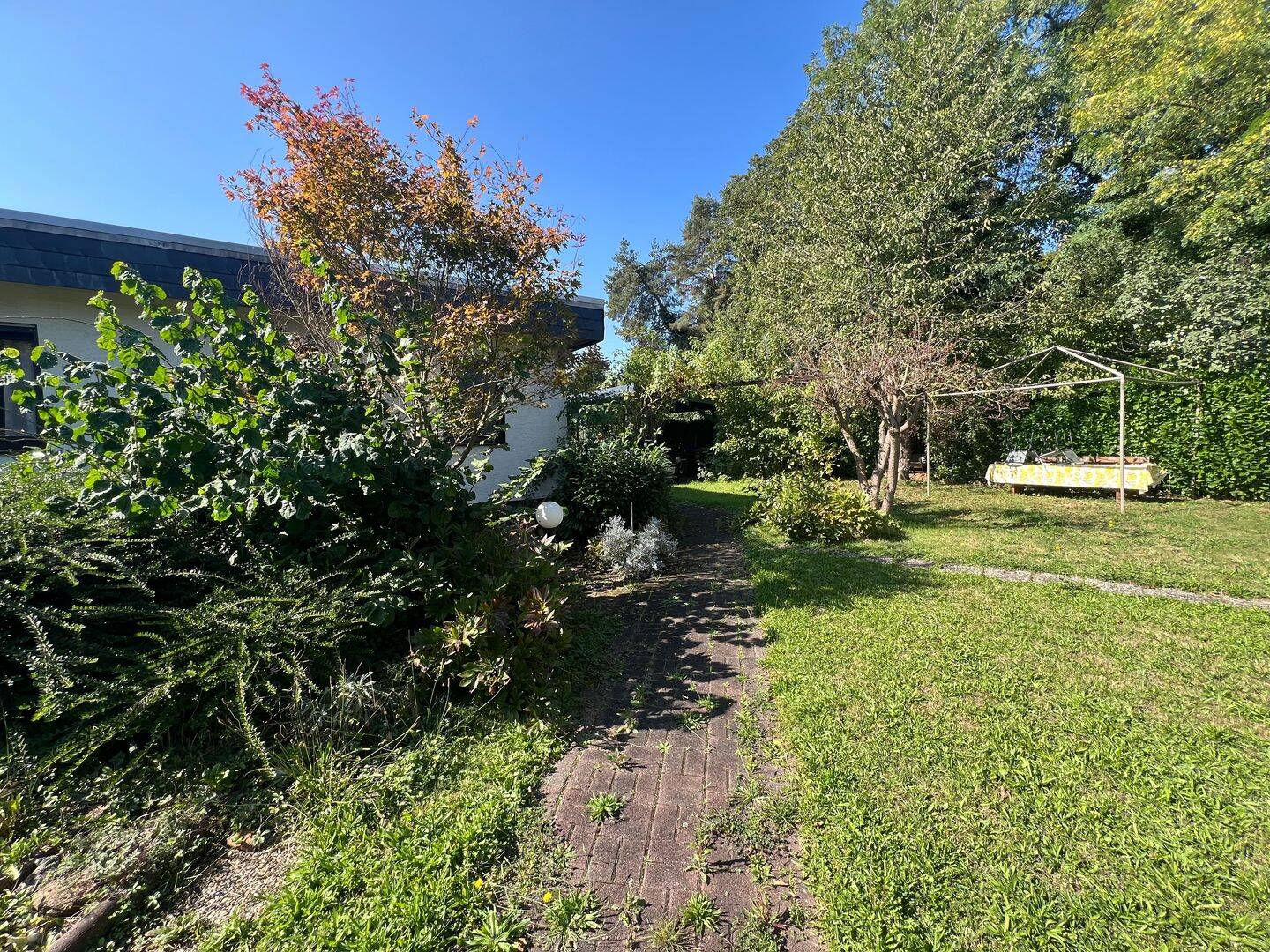 • Blick Richtung überdachter Freisitz im Garten -