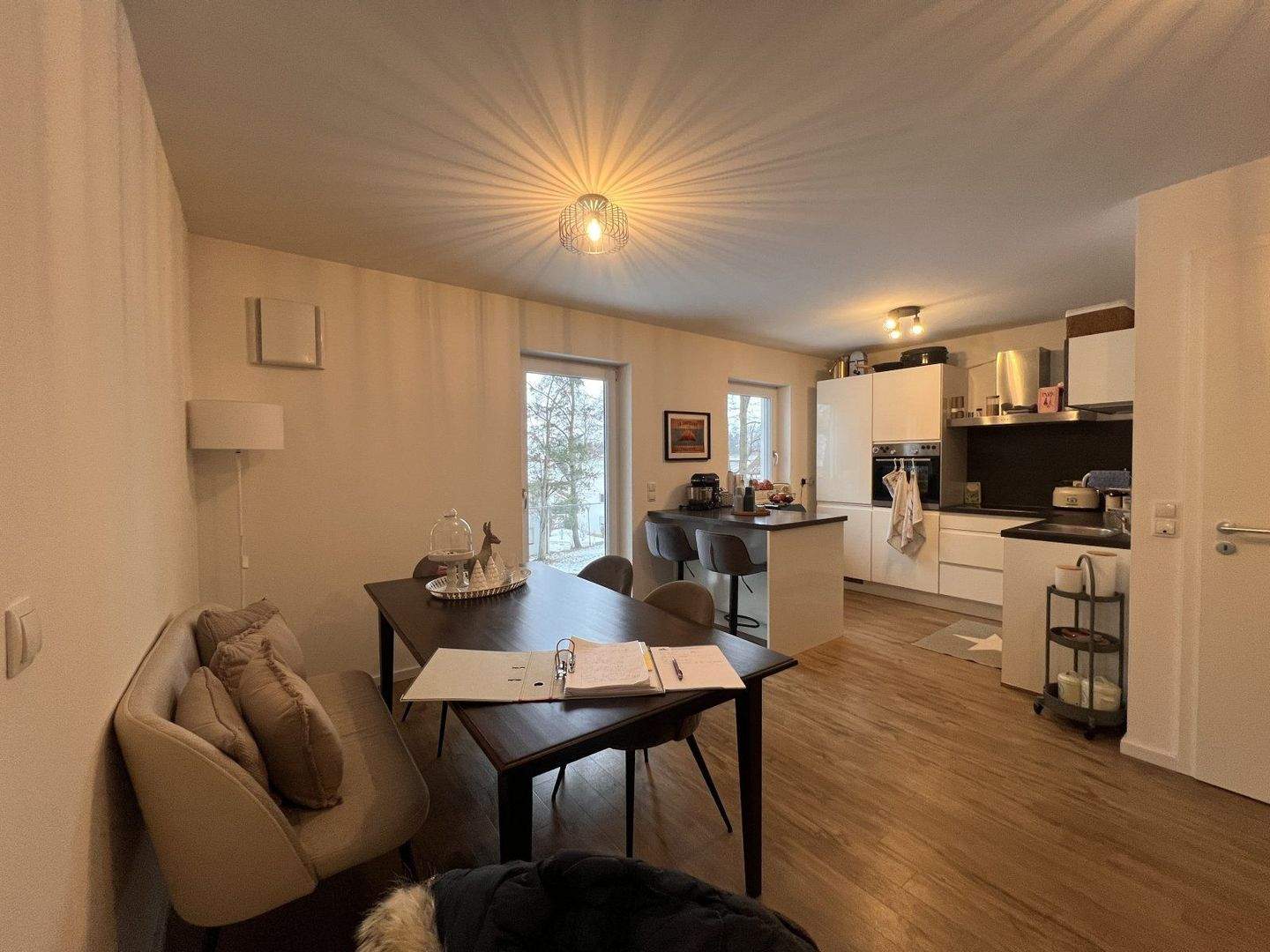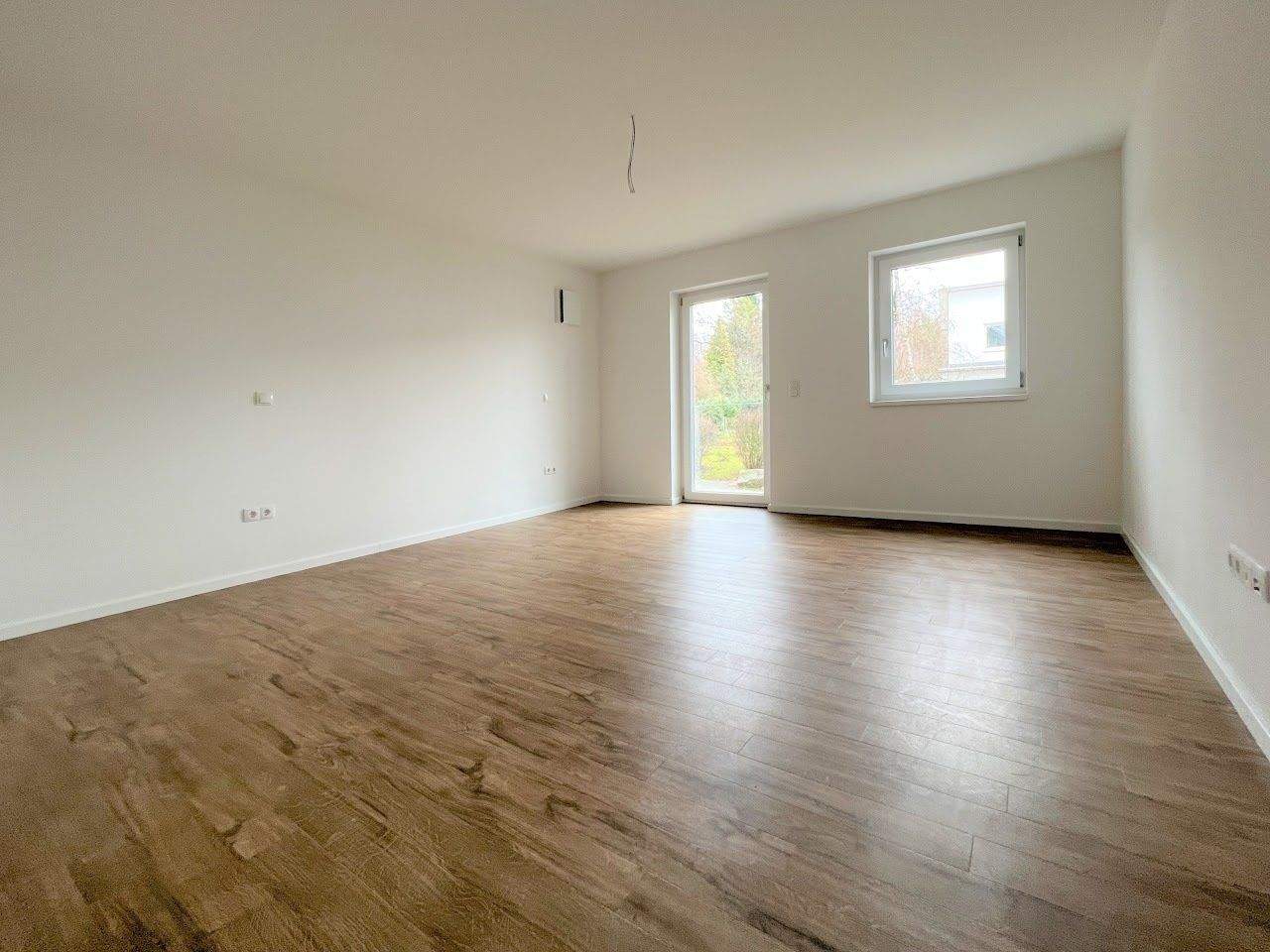 • Lichtdurchfluteter Wohnraum mit hochwertiger Holzoptik-Bodengestaltung und großzügiger Fensterfront -