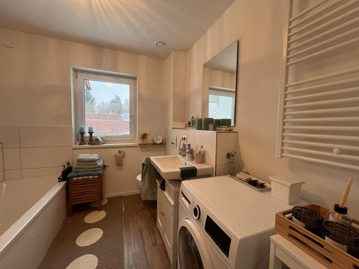 • Praktisches Tageslicht-Badezimmer mit integrierter Waschmaschinenstation und Handtuchablage -