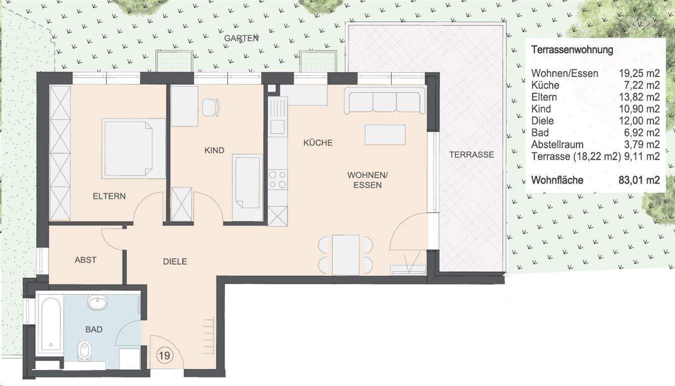VERKAUFS-START: 3-Zimmer-Terrassen-Wohnung ca. 83,00 m², Keller, TG-Platz a. W. WHG-Nr. 19