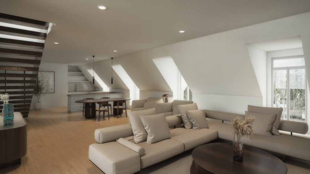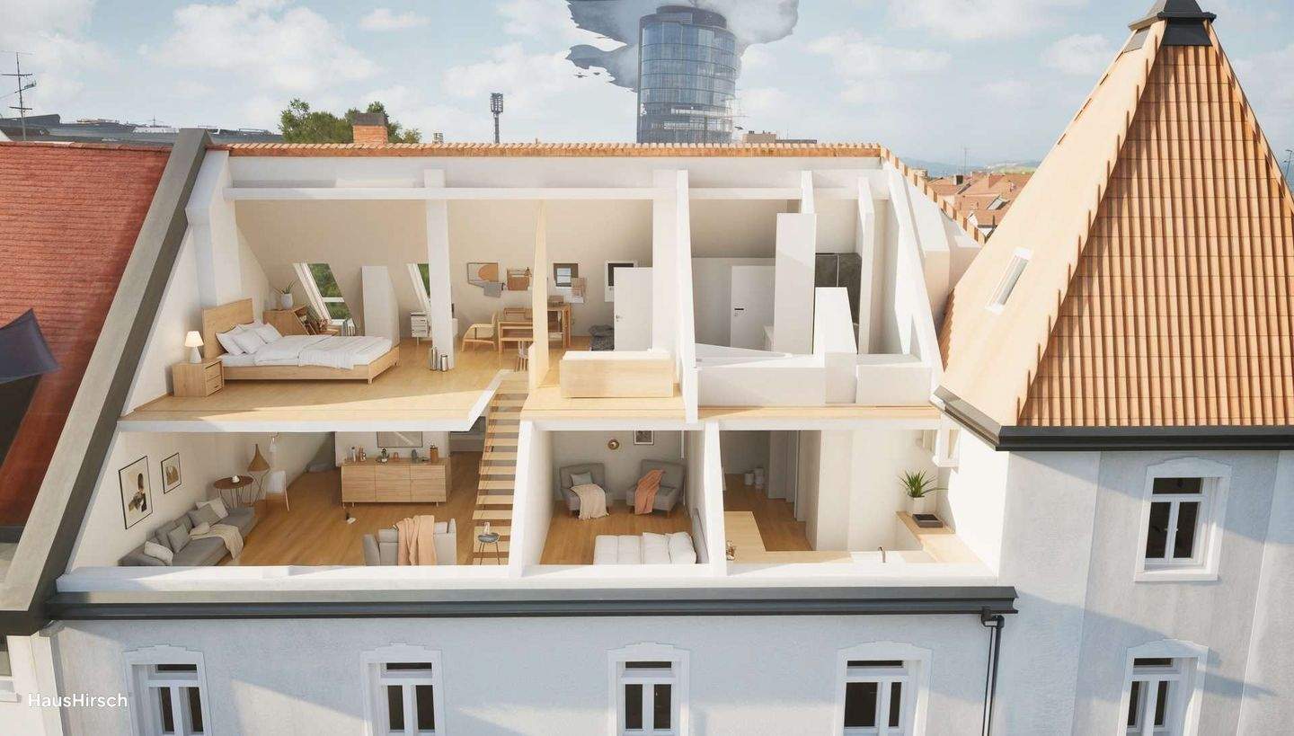 • Visualisierung Wohnbereich - ABOVE THE ROOFS: Spektakuläres Neubau-Loft im Denkmalmantel mit Turmblick & Südterrasse