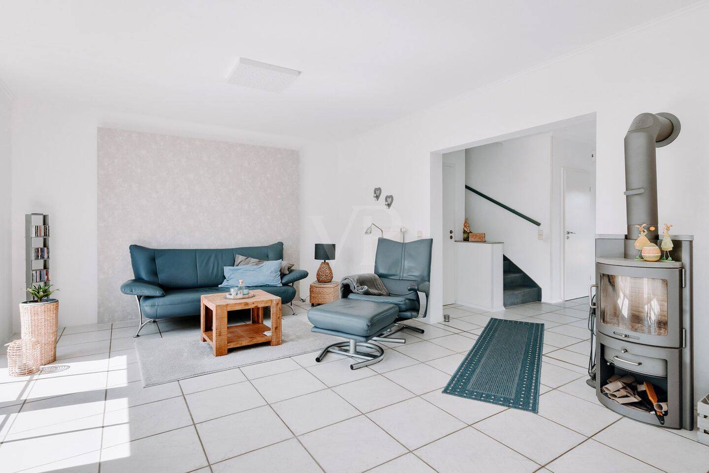 • Im Erdgeschoss: Wohnbereich mit stilvollem Schwedenofen und direktem Terrassenzugang -