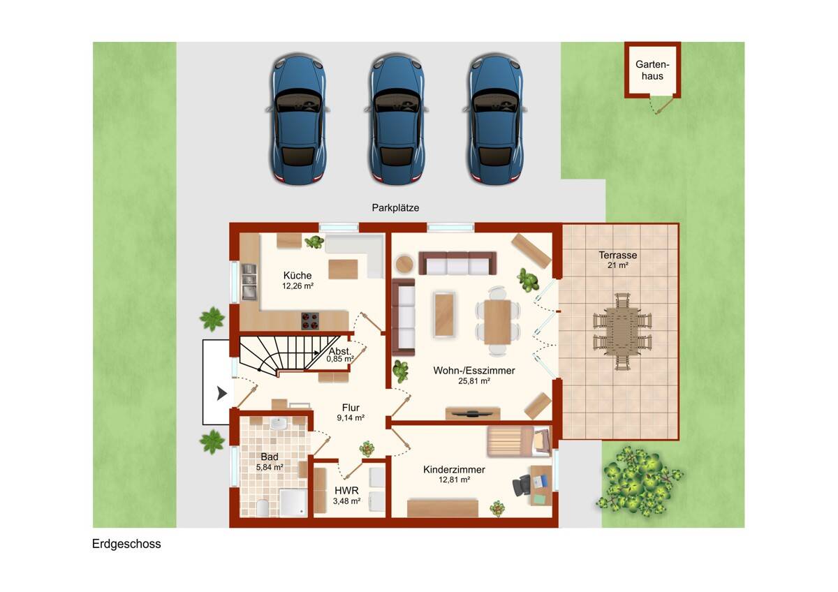 • Ansicht Eingang und Parkplätze vorne - Preis gesenkt! Große & neuwertige DHH in ruhiger Sackgasse, parken am Haus, großer Garten & Terrasse