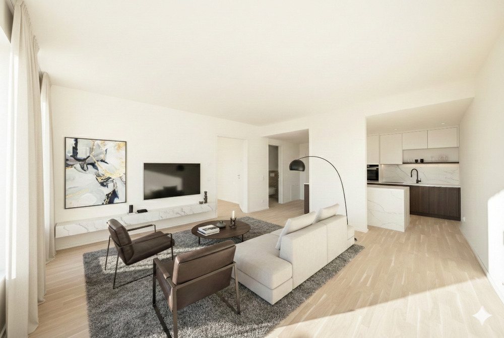 • Einrichtungsbeispiel Wohn- und Küchenbereich - Etagenwohnung mit 54,10 m² in Berlin zum Kaufen