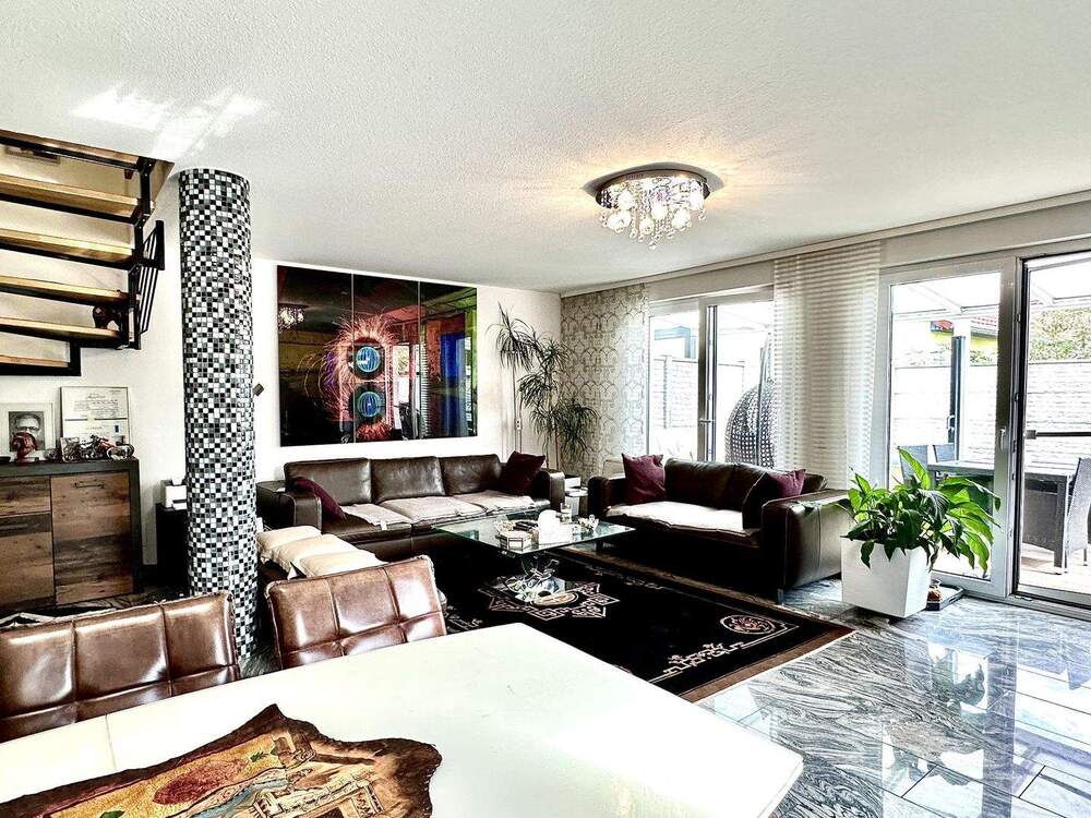 • Blick vom Essbereich zu Wohnzimmer und in die Terrasse -