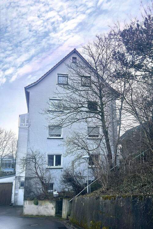 • Hausansicht - Wohnen mit Aussicht! Helle 3 ½-Zi-Whg., frei, mod. TL-Bad, 1. OG, Parkett, EBK, Garage