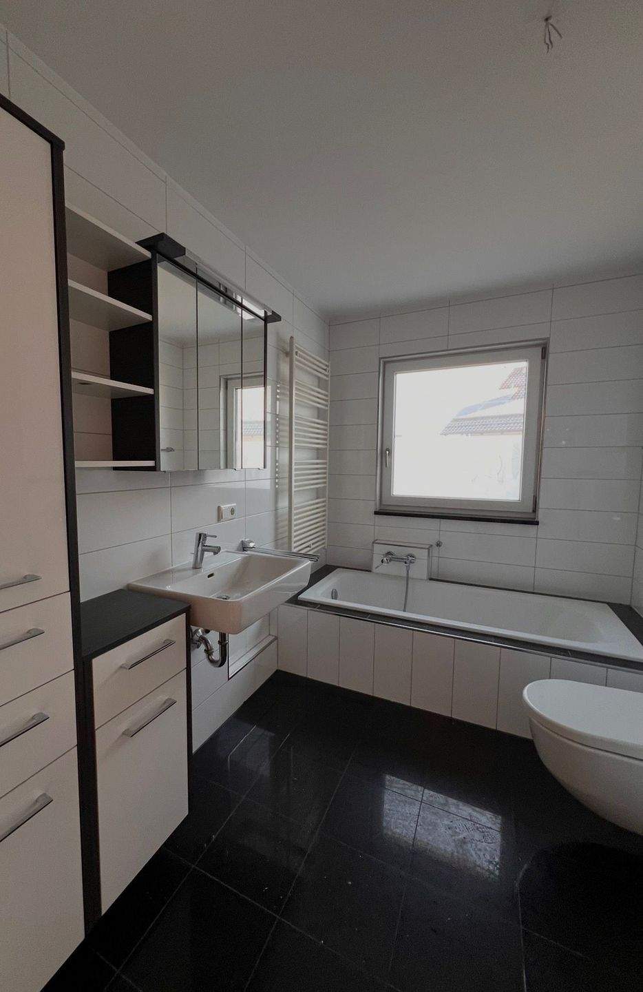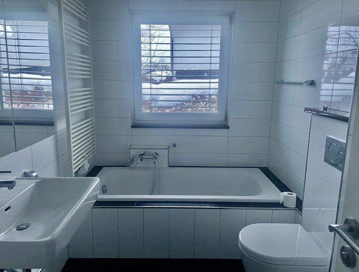 • Modernes Badezimmer mit Wanne, Dusche und Fenster -