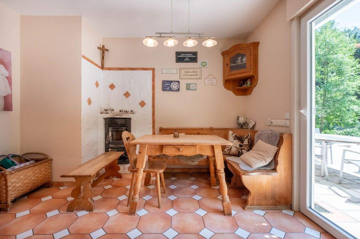 • Wohnzimmer mit Kachelofen und Zugang zur Terrasse -