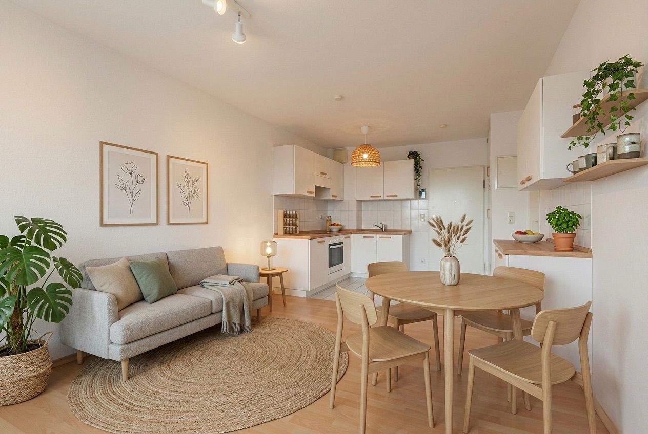 • Wohnen (Einrichtungsbeispiel) - Gemütlicher Wohntraum: 2-Zimmer-Neubau im 6. OG mit Ost-Balkon, Concierge, Lift & TG-Stellplatz