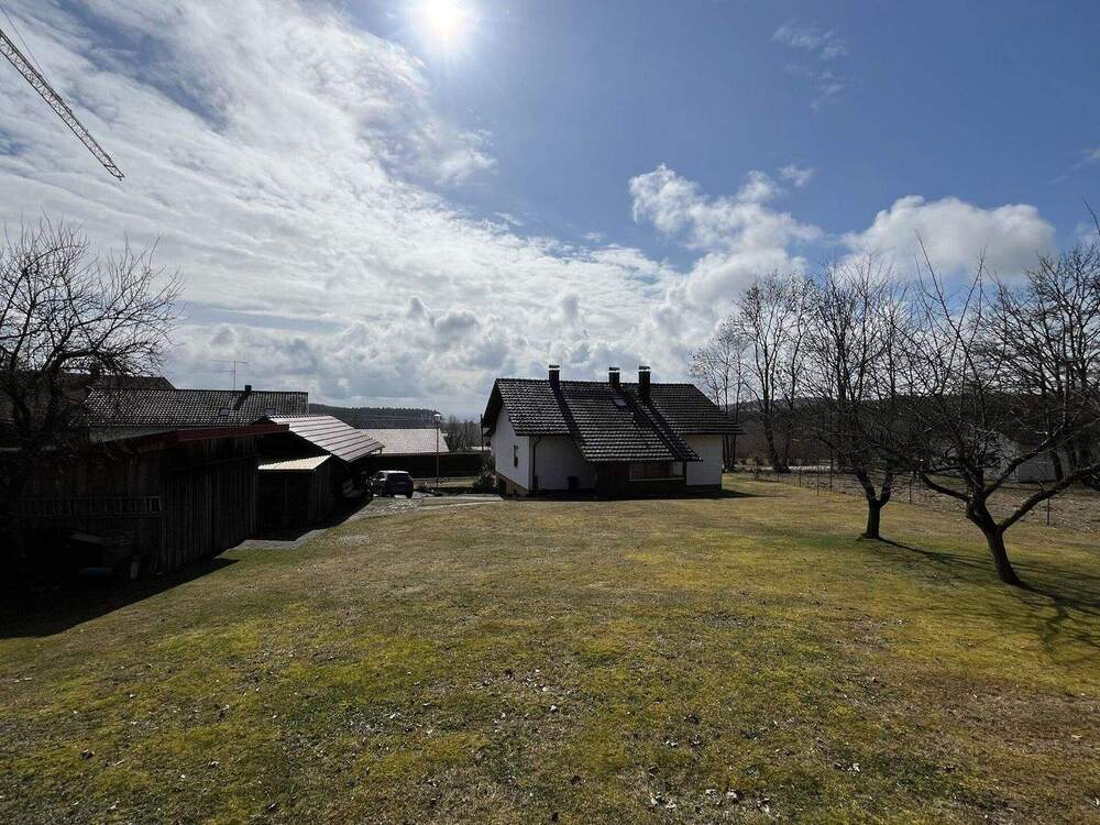 Blick über Garten aufs Haus - Charmantes Einfamilienhaus mit schöner Aussicht nähe Rattiszell. Ihr Zuhause für die Zukunft!