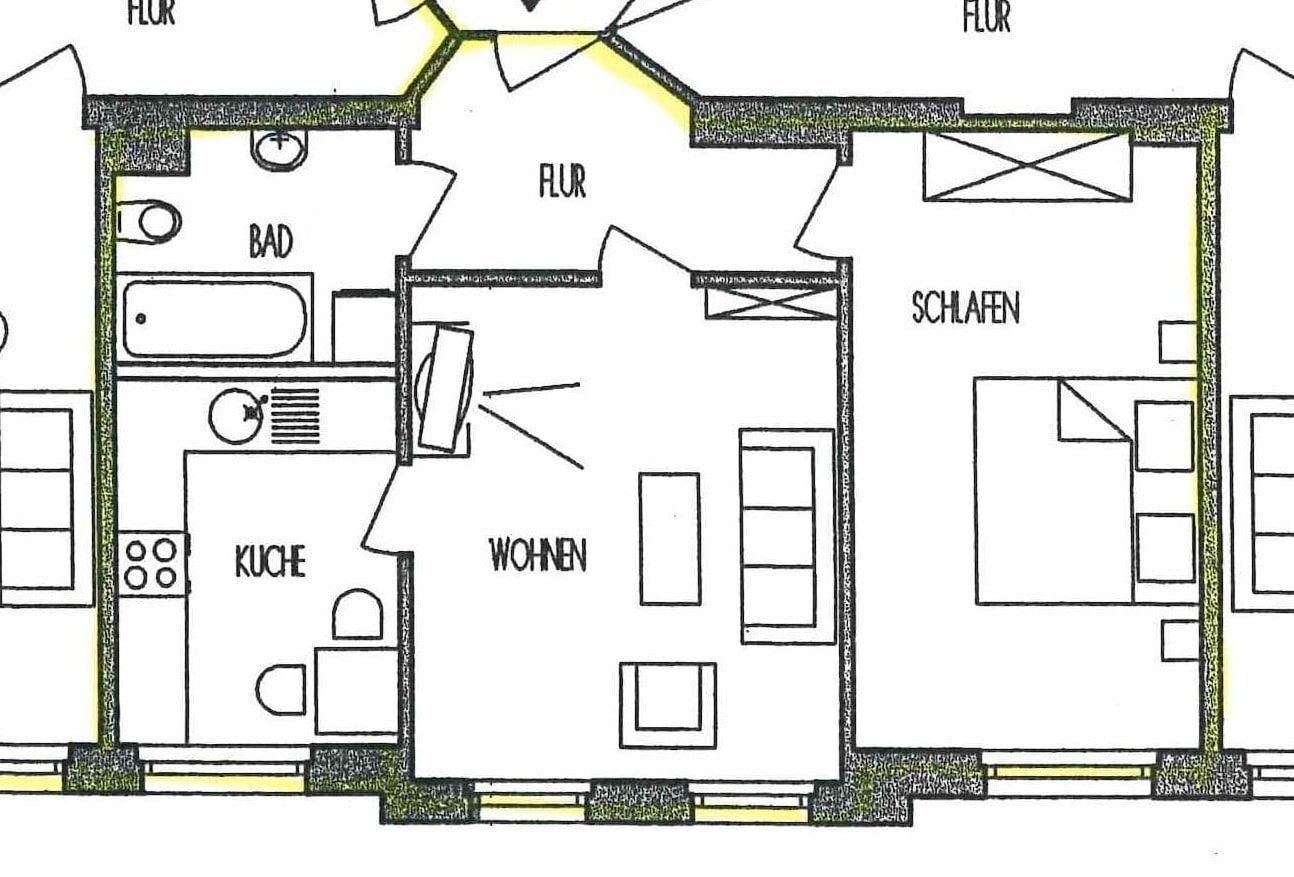 Die Wohnräume sowie der Flur sind mit Laminatboden ausgestattet. Das innen liegende Bad ist mit einer Badewanne, WC, Waschbecken und Waschmaschinenanschluss ausgestattet. Zur Wohnung gehört ein Abstellraum, der sich eine halbe Treppe tiefer befindet. Ein eigenes Kellerabteil ist ebenfalls vorhanden.