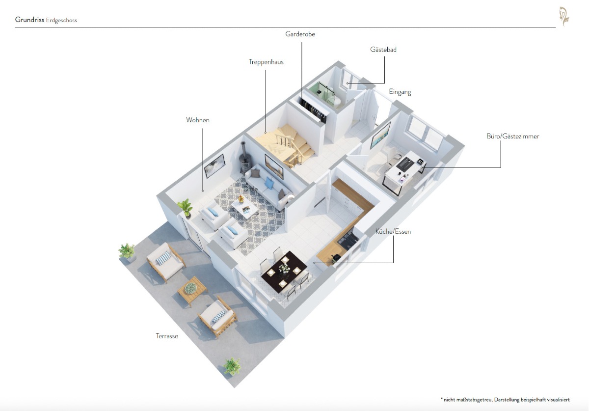 Erdgeschoss Lichtdurchflutetes Wohn-/Esszimmer mit Zugang zur Terrasse Moderne Küche aus 2022 mit Fenster und offener Verbindung zum Wohn-/Essbereich Büro oder Gästezimmer Helles Gäste-Duschbad mit WC (renoviert 2025)